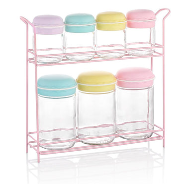 Description : Storage and spice jar set with Pink stand Curated with a stain-resistant and fade-proof material Ideal for managing accommodation of your favorite herbs and seasonings Outfitted with easy...
