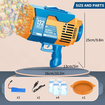 - our amazing upgraded 132 holes bubble gun can blow over 10,000 colorful bubbles in just one minute! Perfect for both day and night use, the gun head is equipped with LED lights, ensuring that the fun never has to stop. The bubble machine is rechargeable, so you never have to worry about running out of power. Get ready to make your bubble dreams a reality with our innovative bubble gun! Package also includes: bubble solution x 2; tray x 1; rechargable battery x 1.