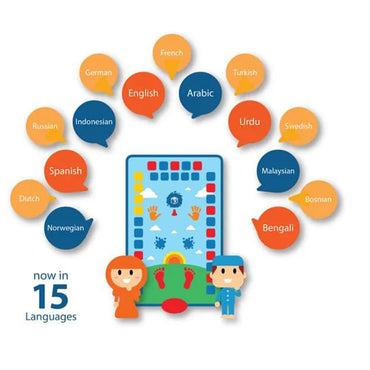 - Interactive prayer mat for kids that combines learning with fun with 15 languages - English, Arabic, German, French, Spanish, Urdu, Malaysian, Indonesian, Bengali, Russian, Turkish, Bosnia, Dutch, Swedish, Norwegian.