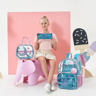 (NET) Mermaid Backpack 13" for Girls Backpack with Lunch Box Set for Elementary Kindergarten Student Kids Clear School Bag for Girls Set 3 pcs / 14101-3