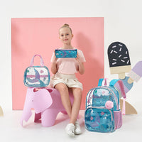 - Kids Clear Bookbag Details: Front pocket made of PVC upgrade material which more durable and better resilience. Outlook it appears semi-transparent. Adjustable Straps Lightweight designed, specifically to suit growing children, the backpack has padded shoulder adjust straps which can effectively relieve shoulders pressure. Great backpack for school, camping, shopping, cycling, traveling etc.