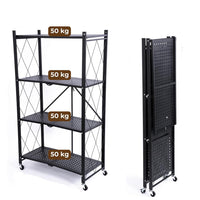 - Equipped with 4 foldable shelves, the maximum weight of each shelf can reach 50kg. You can well store your household and kitchen tools, gadgets and accessories on the standing shelf. The metal mesh on the side protects items from falling.